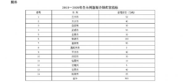 。ㄈ┲С纸ㄔO冰鮮水產品綜合冷庫。依托蘭州國際高原夏菜副食品采購中心、隴南特色農產品交易市場、張掖玉米種子暨農產品交易中心等大型商品交易市場以及成長性好的龍頭企業,建設一批萬噸以上冷庫為主的集散地冰鮮水產品專業市場和綜合型冷庫,新增各類冷庫庫容30萬噸。(責任單位:省商務廳、省發展改革委、省農牧廳,各市州政府、蘭州新區管委會)