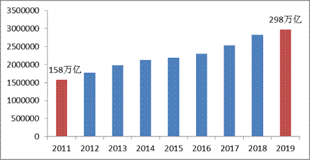 2011-2019年社會物流總額(單位:億元)