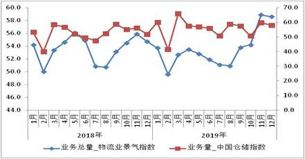 2018-2019年物流業(yè)景氣指數(shù)、中國倉儲指數(shù)業(yè)務量指數(shù)走勢