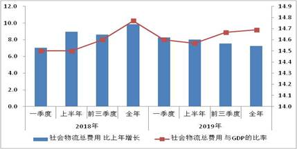 2018-2019年社會物流總費用及與GDP的比率