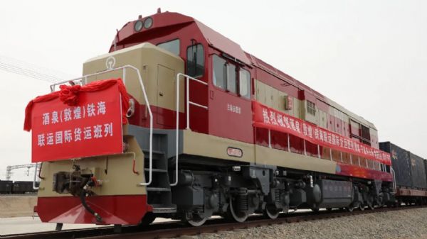 5月26日,酒泉(敦煌)鐵海聯(lián)運(yùn)國(guó)際貨運(yùn)班列(敦煌—寧波舟山港—泰國(guó)曼谷)發(fā)車儀式在敦煌火車站西貨站綜合貨場(chǎng)舉行。
